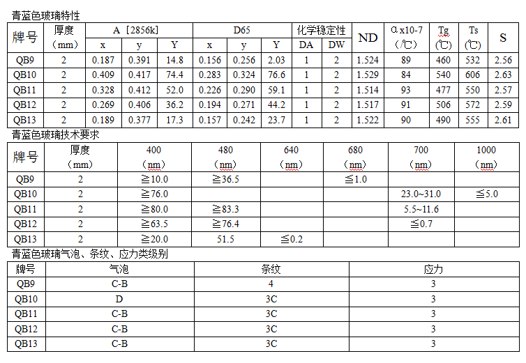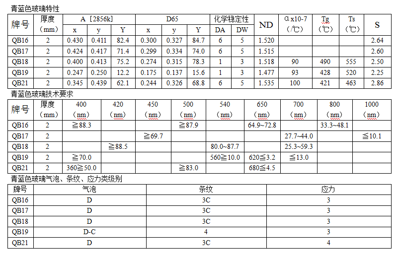 青藍色玻璃——牌號:QB1/QB2/QB3/QB4/QB5